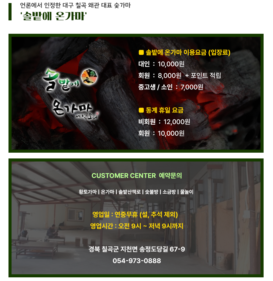 • 상호명 : 솔밭에온가마 & 세빛오리 | 사업자등록번호 : 107-06-81437 | 주소 : 경북 칠곡군 지천면 송정도당길 67-9